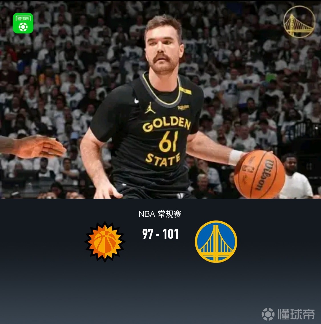 北京时间2月6日NBA 常规赛,菲尼克斯太阳对阵金州勇士。上半场双方呈现拉锯局面,半场太阳55-59勇士,第三节初勇士一度领先10分,随后太阳展开持续反扑完成反超持续拉大分差,末节初太阳一度领先14分,但比赛最后10分钟勇士轰出一波25-7完成逆转,最终太阳97-101勇士。
