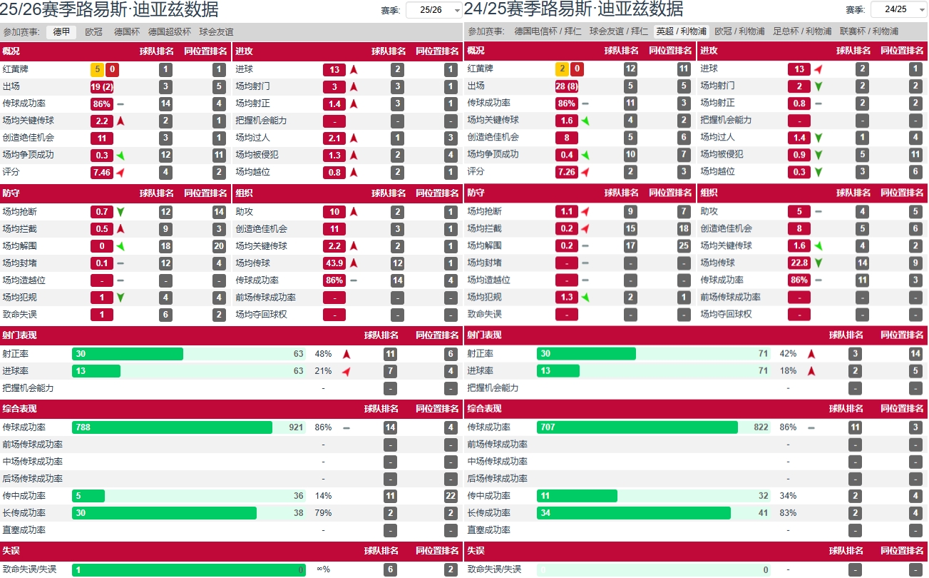 对阵霍芬海姆的比赛只是迪亚斯极致效率淋漓尽致的一次展现:单场5次射门4次射正,10次过人7次成功,传球成功率高达94.7%,而帽子戏法加两造点也让其单场参与进球数追平拜仁队史边锋纪录。而将时间线拉至整个2025-26赛季,迪亚斯数据升级后的效率会更加明显。