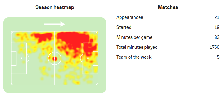 若将数据截至德甲第21轮,迪亚斯代表拜仁每69分钟参与1球,甚至超越了凯恩的每72分钟参与1球,他才是拜仁队内的效率王。作为本赛季德甲第二位,也是本赛季五大联赛第二位完成“两双”的球员,他的射门转化率虽从赛季初的25.7%回落至22.4%,但关键战射门转化率高达31.2%。更难得的是迪亚斯的稳定性:除去欧冠赛场的红牌停赛,迪亚斯本赛季出场时间共计2289分钟(联赛1750分钟),为拜仁锋线出场时间之最。而当他缺席时,拜仁左路进攻效率骤降41%,场均突破从6.8次跌至4.0次,进攻三区创造机会从5.2次降至2.9次,这都是最直观的数据体现。