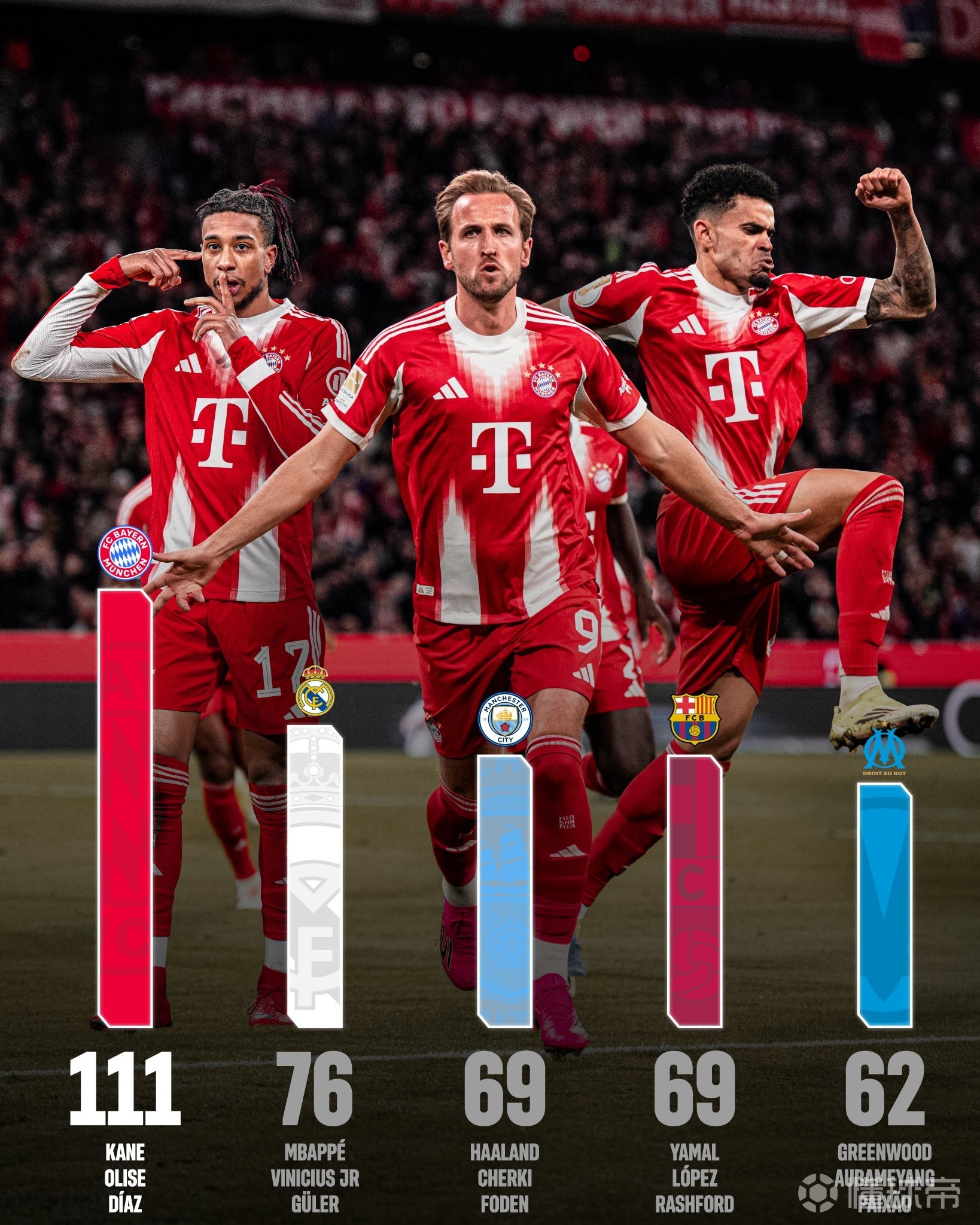 拜仁官方晒三叉戟进球数据:直接参与111球全欧洲第一
