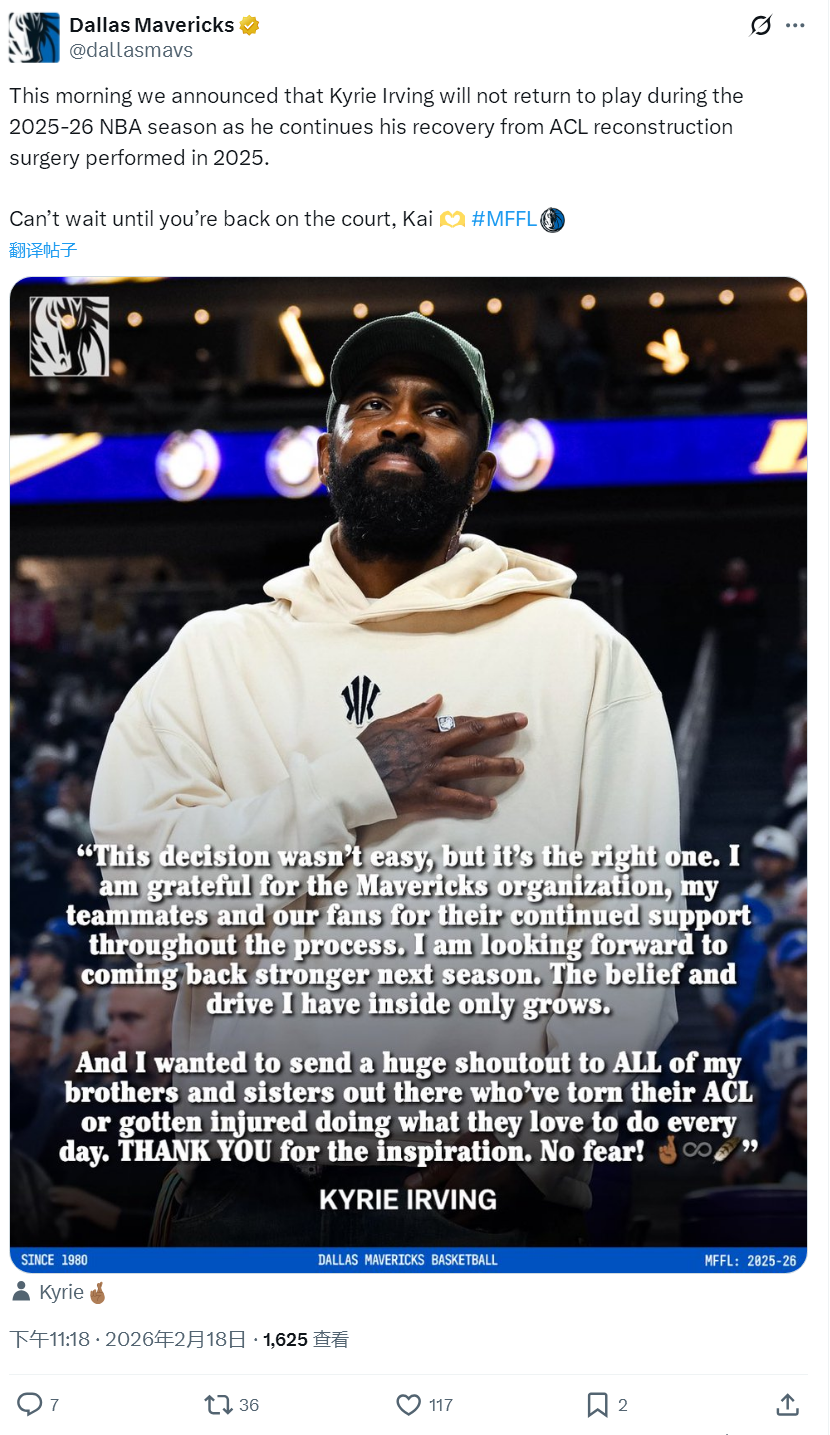 官宣!欧文赛季报销!独行侠三状元成了笑话